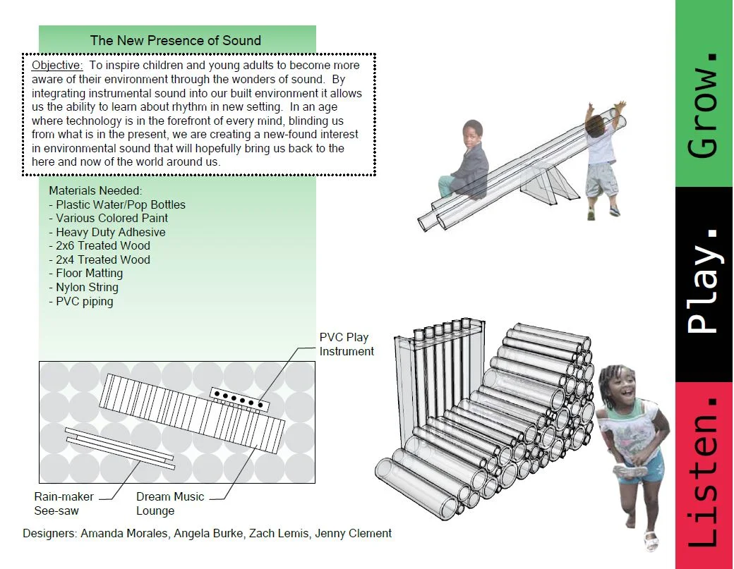 During a local annual Detroit Music Festival, the production sponsors community outreach projects with an emphasis on art & music culture. This project was inspired by the way children engage and interact with their built environment through play. The main apparatus, the dream music lounge, is where one child can sit & listen to sound while another plays music/sound through the integrated tubes along the side. With this organ-like design, the tubes reverberate different sound qualities based on varying tube lengths. The accessory element, the rain-maker see-saw, the tubes are filled with dried beans & rice and enclosed to emulate the sound of rain as the children play. And again using tube length variability to create different sound qualities. During implementation, we noticed that children were excited by the sounds & their curiosity was peaked to entice an even greater sense of wonder. Mission accomplished.